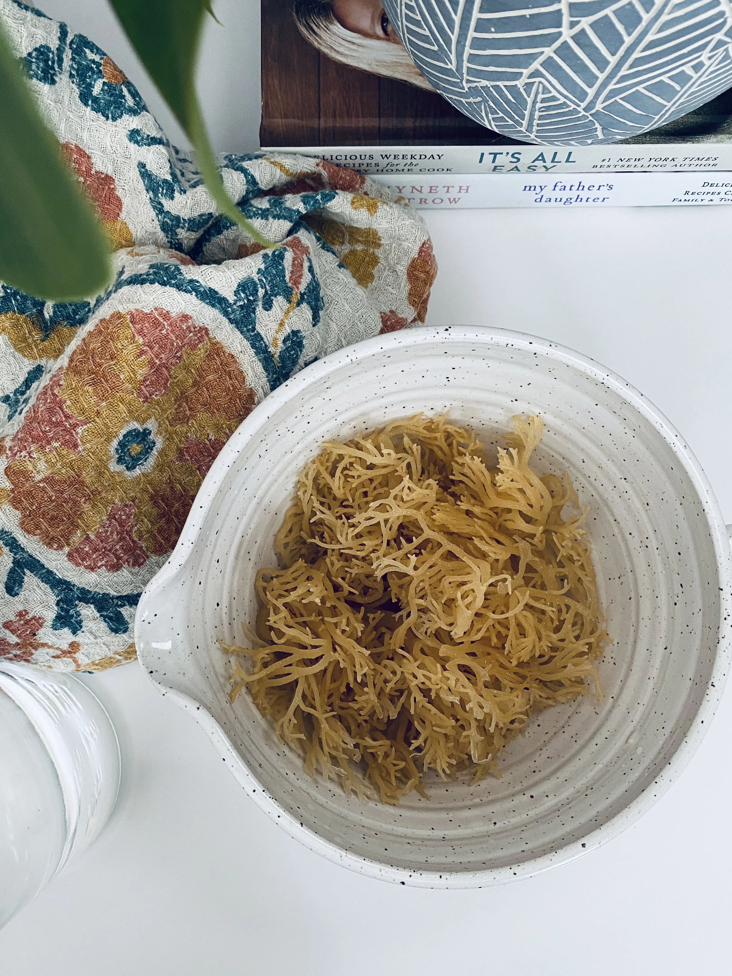 Prepare your moss by thoroughly cleaning it. Soak moss for roughly 8 hours at room temperature in a large bowl with filtered water. I like to rinse and change the water once or twice during soaking to ensure it's clean from dirt or sea shells. Once it has doubled in size and starts to take on a translucent colour, it's ready to blend. Measure about 130 grams of moss with 1 & 1/2 cups of water and blend in the jar of a high-speed blender until smooth and creamy.